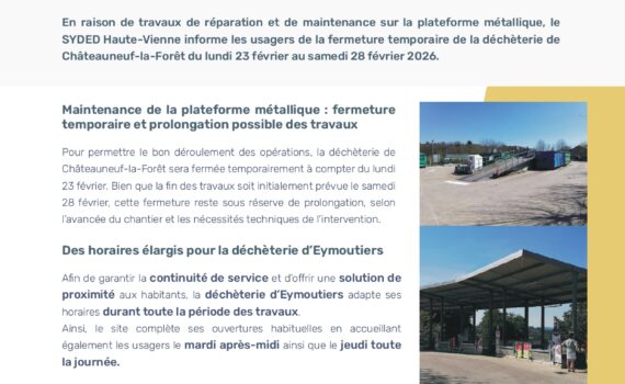 Pour la 9ème année consécutive, le SYDED et Limoges Métropole organisent conjointement une collecte exceptionnelle de pneus à destination des particuliers, du lundi 9 février au dimanche 1er mars 2026 dans 11 déchèteries du SYDED : Ambazac, Bosmie-l’Aiguille, Châlus, Eymoutiers, Magnac Laval, Nexon, Saint-Bonnet-de-Bellac, Saint-Germain-les-Belles, Saint-Junien, Saint-Léonard-de-Noblat et Saint-Yrieix, et dans […]